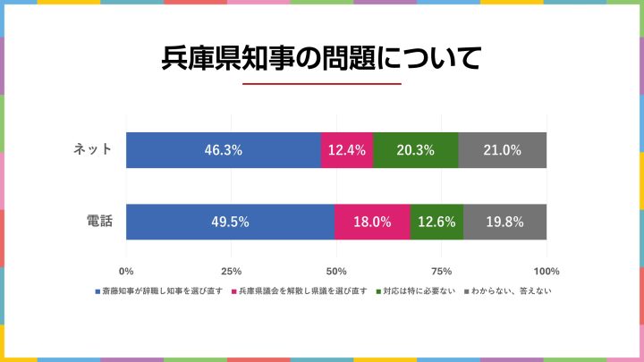 電話調査・インターネット調査ともに「斎藤知事が辞職し知事を選び直す」が約5割で最多となり、「対応は特に必要ない」を大きく上回る結果となりました。