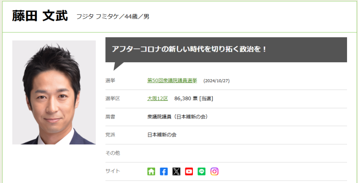 日本維新の会は8日、参院選の結果を受けて辞任した前原誠司共同代表の後任を選ぶ「国会議員団代表選挙」を行い、藤田文武(ふじた・ふみたけ)衆院議員を選出しました。このコラムでは藤田氏の略歴、政策を紹介します。