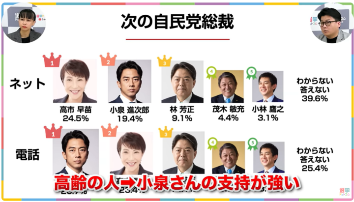 もう一つは、高市氏がYouTube上を中心とした「ネット地盤」をもっていることです。若い世代にはYouTubeなどネットメディアを通じて政治情報を収集する傾向が強く、YouTubeなどでネット基盤を固めている高市氏への支持が厚い