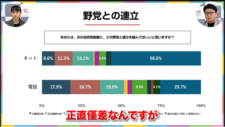 「あなたは、次の自民党総裁に、どの野党と連立を組んでほしいと思いますか?」という設問では、ネット調査で国民民主党(13.1%)、電話調査で日本維新の会(18.7%)がそれぞれ最も多くの回答を集めました。この結果も、ネット調査と電話調査の年齢層の違いを反映しているとみられます。