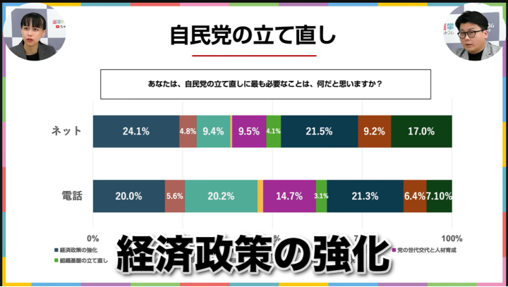 「あなたは、自民党の立て直しに最も必要なことは、何だと思いますか?」という問いでは、ネット調査で「経済政策の強化」(24.1%)が、電話調査で「政治とカネの問題解決」(21.3%)がそれぞれトップに挙がった。
