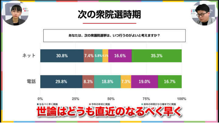 最後に、「あなたは、次の衆議院選挙は、いつ行うのがよいと考えますか?」と尋ねた結果、電話・ネット調査ともに「なるべく早く実施」という回答が両調査で3割前後を占めました。これに、「今年の年末に実施」「来年の年明けから春までに実施」を足し合わせると、この半年以内での衆院選を約6割が望んでいることになります。