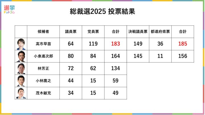 選挙前から高市氏と小泉進次郎氏による一騎打ちとの下馬評が流れ、特に決選投票で勝利のカギとなる議員票を集めると目されていた小泉氏が優勢と予想する声が多く聞かれました。しかし、蓋を開けてみれば、小泉氏の議員票は事前予想を下回り、決選投票では高市氏が党員票だけでなく議員票も集めて勝利をつかみ取りました。