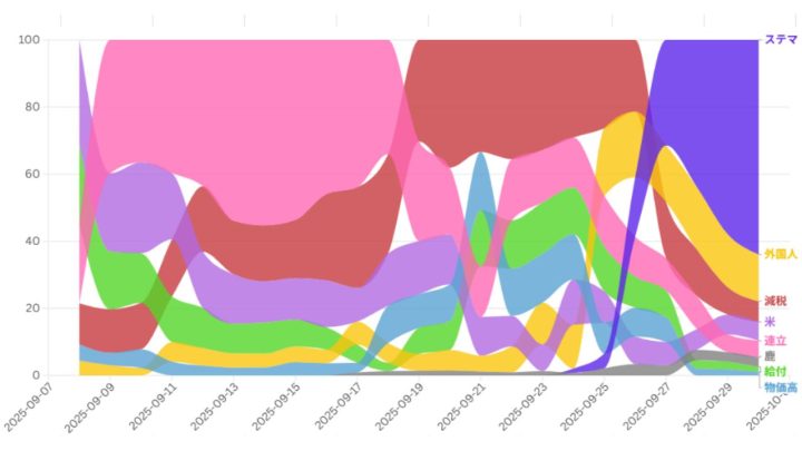 総裁選関連キーワードのトレンドをみると、選挙前から選挙期間中に3つの波が現れていたことが分かります。告示前は「連立」、選挙序盤は政策論点として「減税」への関心が高まりました。