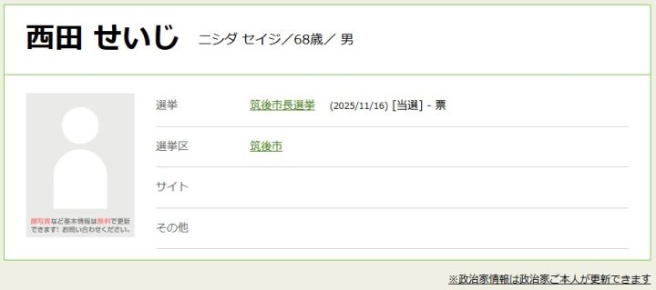 福岡県筑後市長選挙が11月9日に告示され、現職の西田正治(にしだ・せいじ)氏(68)のほかに立候補の届け出がなかったため西田氏が無投票3選しました。