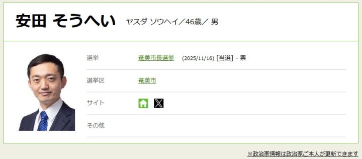 鹿児島県奄美市長選挙が11月9日に告示され、現職の安田壮平(やすだ・そうへい)氏(46)のほかに立候補の届け出がなかったため安田氏が無投票で再選しました。