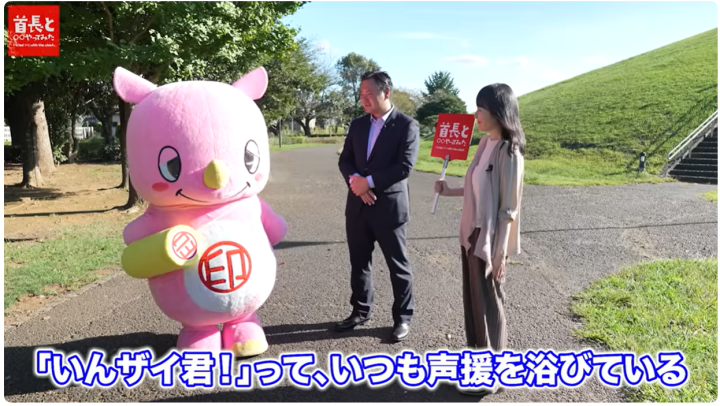 市長との待ち合わせ場所となったのは、この特徴を象徴する牧の原公園です。市内でも一人あたりの公園面積が千葉県内で一番大きいという、緑豊かな環境です。尻尾の先が市の花であるコスモスの色をした市のマスコットキャラクターの「いんザイ君」も駆けつけてくれました。