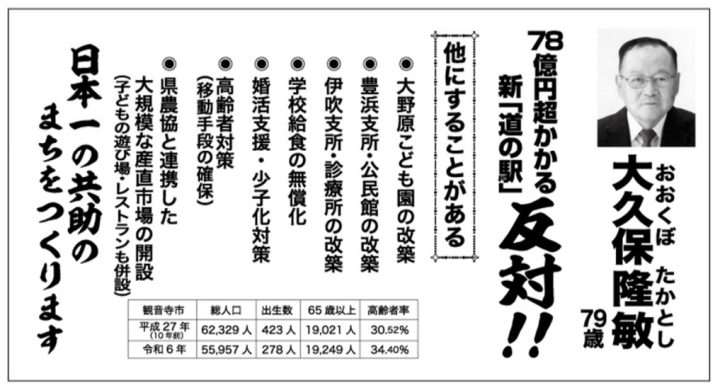 大久保氏は観音寺市出身。2005年から観音寺市議会議員選挙で5期連続当選しました。