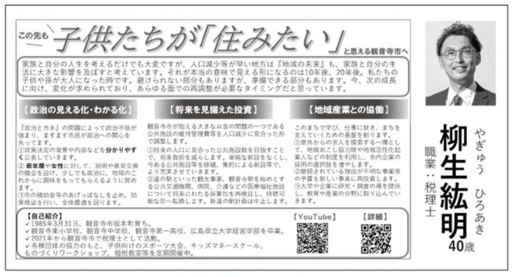柳生氏は観音寺市生まれ、広島県立大学経営学部卒業。東京コンサルティングファーム、福永会計事務所、ひょうご税理士法人、渡邊洋一税理士事務所を経て、2021年に五代会計事務所を開業。2024年の観音寺市議会議員補欠選挙に当選しました。