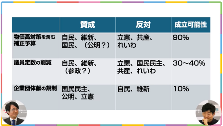 期日前氏:これ何回も聞いてましたもんね。じゃあ維新の目線で行くと、例えば補正予算に関しては賛成するのか反対するのか、定数削減は関係なく賛成するっていう認識ですか?