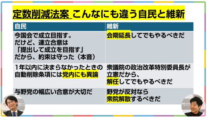 今野記者:まあ、千葉が減るからってより、やっぱ浜田さんって僕も昔から担当したことがあるけど、割と真っすぐな方というか、道義が通らないことを俺はやらんみたいな方だから。維新が言ってる1年議論してダメだったら自動的に小選挙区25と比例20減らす、その数字も期限も理屈が立たないだろうってお考えだと思う