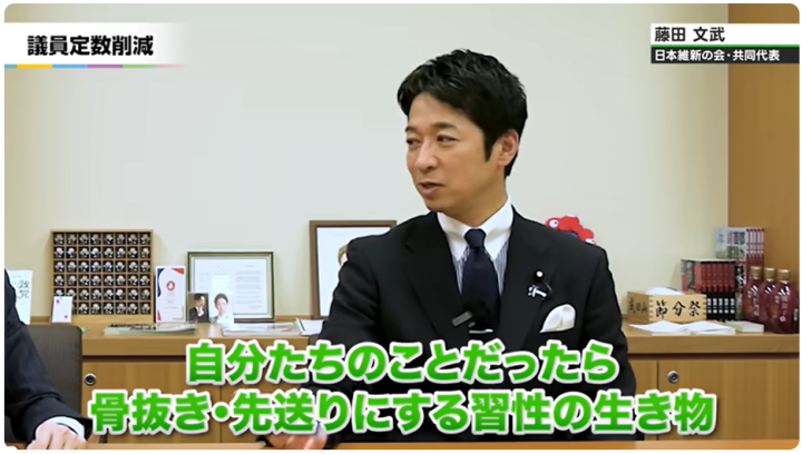 議員定数削減は過去にも、各政党が提案してきた背景があります。藤田氏は次の国会で議員定数削減が決着しなければ「国会議員っていうのは議論を延々とやって最後決めない。自分たちのことだったら骨抜きにする、先送りにする生き物なんじゃないんですか」との問題意識を示し、次期国会での成立に向けて不退転の覚悟で臨むと語ります。