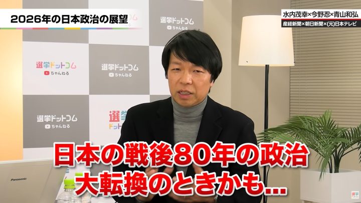1月8日公開の「選挙ドットコムちゃんねる」では初登場・政治ジャーナリストの青山和弘氏と産経新聞編集長の水内茂幸氏、朝日新聞記者の今野忍氏が気になる政局ニュースを解説!自民党重鎮が描くのは国民・維新との連立構想!?若年層にも広がる高市支持の背景とは。「戦後レジーム」が終焉する国際情勢下、永田町の激変をプロの政治記者3人が読み解きます。