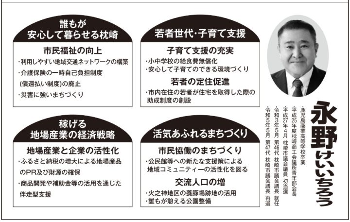 永野氏は鹿児島県喜界町生まれ、鹿児島商業高等学校卒業。昨年10月まで保険代理店ウタツほけん事務所に務めました。枕崎商工会議所青年部会長を歴任し、2015年から枕崎市議会議員選挙で3期連続当選しました。