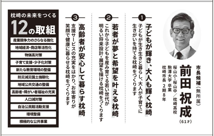 前田氏は枕崎市生まれ、駒澤大学経済学部卒業。薩摩酒造株式会社勤務を経て、2018年の枕崎市長選挙で初当選。今回は3期連続当選を目指しての立候補となります。