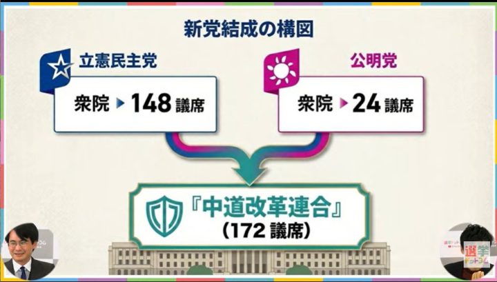 今野記者:中身としては一応、立憲民主党の148人と、公明党の24人が合流して172人。自民党が今196だから、自民党とほぼ肩を並べる中道政党ができましたと。中道政党(自称)ができましたと。