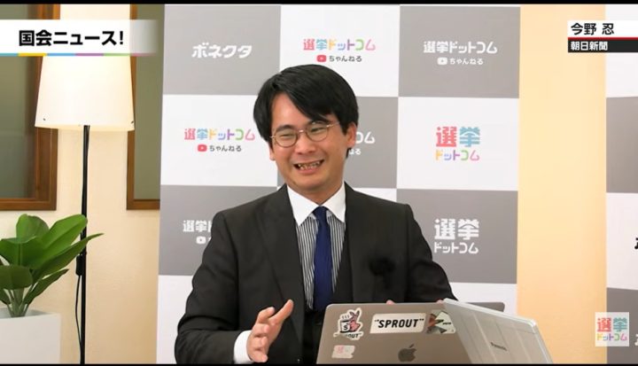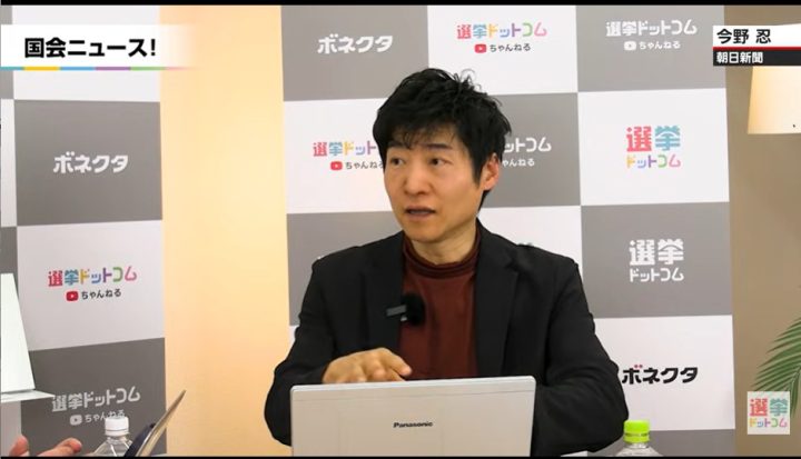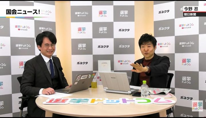 今野記者:若干、立憲民主党(のロゴ)に似てるよね。立憲の「立」の字と憲法の「憲」の字がさ、上下でデザインされてなかった?