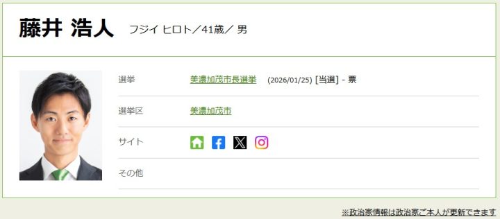 岐阜県美濃加茂市長選挙が1月18日に告示され、現職の藤井浩人(ふじい・ひろと)氏(41)のほかに立候補の届け出がなかったため藤井氏が無投票で当選しました。