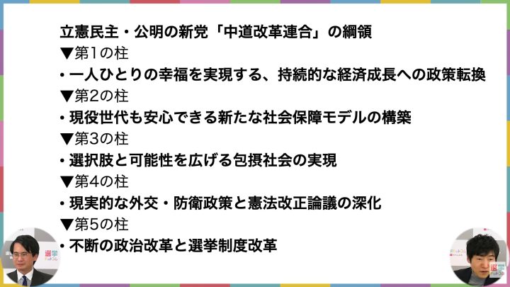 今野記者:公明党の「中道改革ビジョン」、これは2025年11月に発表した5本柱で、「新たな社会保障モデルの構築」「包摂社会の実現」「1人当たりのGDPの倍増」「現実的な外交・防衛政策と憲法改正」「政治改革の断行と選挙制度改革の実現」。
