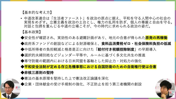 今野記者:これが綱領で、綱領を具体的な政策にしたのが基本政策になります。ポイントはやっぱり原発政策と安全保障政策だよね。旧立憲民主党は、共産党との選挙のすみ分けの関係もあって、結党時から1日も早い原発のない社会を実現すると言っていたし、安保法制についても「違憲部分の廃止」と言っていた。ただ、野田代表はその違憲部分がどこかについては「政権を取ってから防衛省やアメリカと相談したい」って言っていて、どういうことやねんという話だったんだけど。