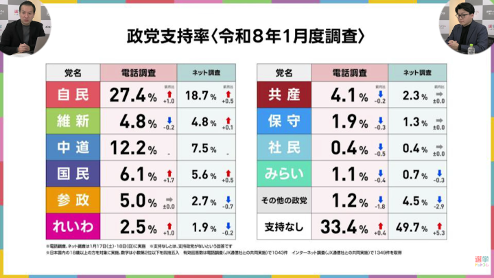 そして、新党「中道改革連合」の支持率は電話調査で12.2%のスタートとなりました。これは、前月の立憲(7.9%)と公明(5.1%)の支持率を単純合算した数値とほぼ同等です。