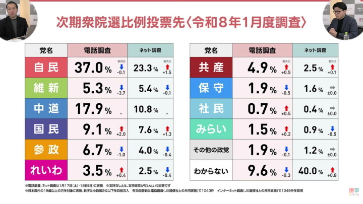 1月20日公開の「選挙ドットコムちゃんねる」は、選挙ドットコムとJX通信社による意識調査結果の速報解説です!高支持率をキープしていた高市内閣が初の下落傾向へ?新党「中道改革連合」のスタートの支持率は?JX通信社の米重克洋氏が解説します。