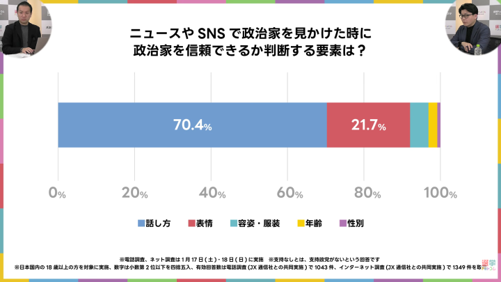 今月は、「ニュースやSNSで政治家を見かけた時に政治家を信頼できるかを判断する要素」も調査しました。結果は7割が「話し方」で、「表情」や「容姿・服装」などを大きく上回りました。