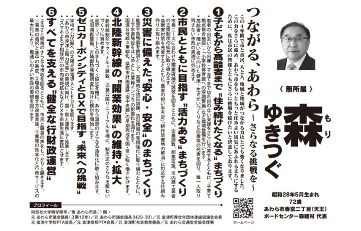 森氏は旧 金津町(現 あわら市)生まれ、同志社大学商学部卒業。2009年からあわら市議会議員を3期連続で務めました。2022年のあわら市長選挙で初当選、今回は2期連続当選を目指しての立候補となります。