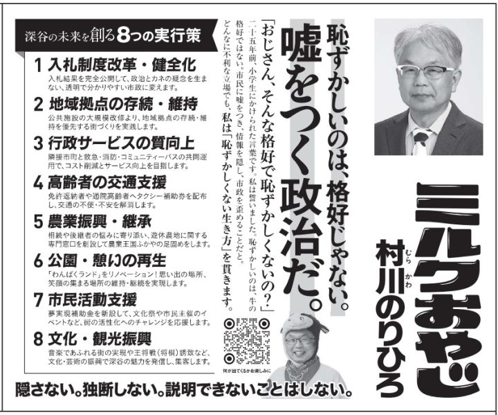 ミルクおやじ氏は本名を村川徳浩(むらかわ・のりひろ)氏、学習院大学理学部物理学科中退。2011年から深谷市議会議員選挙で4期連続当選しました。現在はシンガーソングライターとしても活動しています。