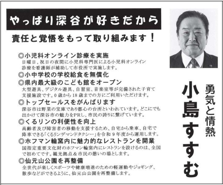 小島氏は埼玉県立本庄高等学校卒業。1995年から深谷市議会議員を3期連続で務め、2007年の埼玉県議会議員選挙で初当選。2010年の深谷市長選挙で初当選。今回は5期連続当選を目指しての立候補となります。