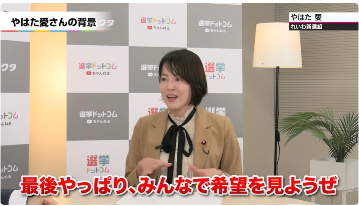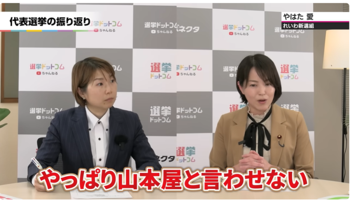 1月11日公開の「選挙ドットコムちゃんねる」にはれいわ新選組衆院議員のやはた愛氏がゲスト!昨年末の党代表選挙に立候補したやはた愛氏。今回のインタビューでは、山本太郎代表の「1枚看板」からの脱却と、今後の党の支持拡大に向けた戦略について熱く語っています。(編集部注※1月23日の衆議院解散によって現在は「前職」となりますが、今回は収録当時の肩書である「衆議院議員」としてご紹介します)。