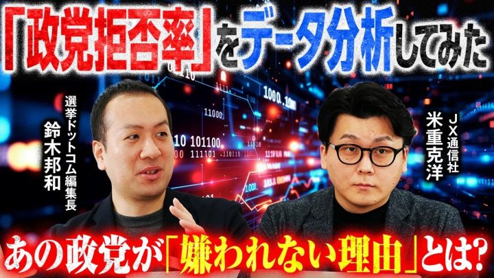 2月26日公開の「選挙ドットコムちゃんねる」では、選挙ドットコムとJX通信社が独自に調査した指標「政党拒否率」を元に各党の支持構造分析を紹介。有権者が「どの政党を支持するか」ではなく「どの政党にだけは絶対に入れたくないか」というデータから、驚きの実態が浮かび上がりました。日本共産党や中道改革連合が高い拒否率を示す一方で、国民民主党やチームみらいが持つ驚異的な「伸びしろ」とは。JX通信社の米重克洋氏が、最新の調査結果を基に野党一本化の難しさと日本政治の深層を鋭く解説します。