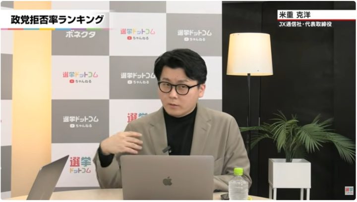 MC鈴木:早速行きましょうか。まずこの、先週末ですね、選挙ドットコムとJX通信社さんで実施をさせていただいた調査による「政党の拒否率」を政党別にランキングしたものです。この拒否率の定義から含めて、米重さん、ご説明いただいてもいいですか?