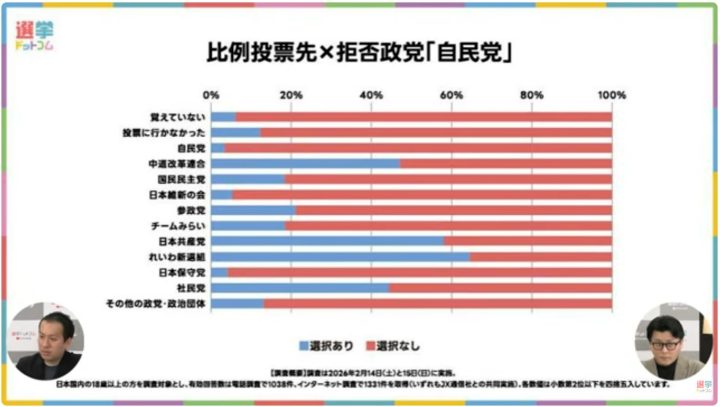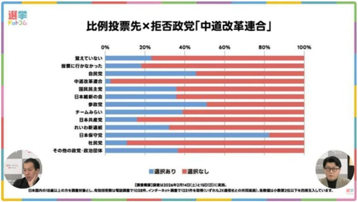 米重氏:そうですね。だから左側の一覧のところは、基本的にどの政党に投票したかという。で、今回の場合はその「自民党を拒否している人」の割合が、投票先の中でどれぐらいいるか。例えば「中道改革連合」に投票したっていう人は、上から4行目なわけですけれども。ここに関しては、自民党を拒否している人が半分近くいるっていう。