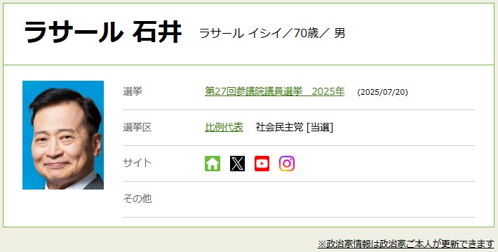 ラサール石井氏は1955年、大阪市生まれ。鹿児島ラ・サール学園高等学校卒業、早稲田大学第一文学部除籍。「コント赤信号」のメンバーとしてテレビのお笑い番組やクイズ番組、ドラマ、舞台、映画などにも出演。演出家としても活動してきました。2025年参院選で初当選し、現在1期目。2025年9月に副党首に就任しました。