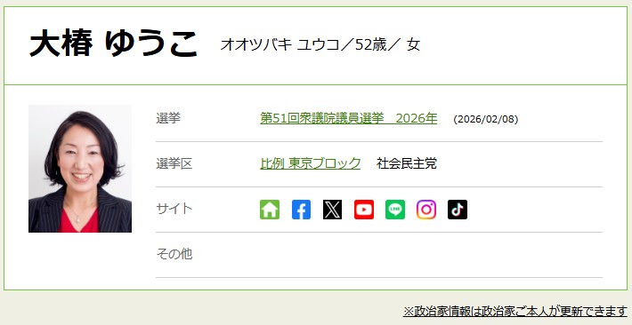 大椿氏は1973年、岡山県生まれ。四国学院大学社会学部社会福祉学科卒業後、フィリピン留学や関西学院大学での障がい学生支援コーディネーターに勤務しました。自身が雇止め解雇にあった経験から政治の道に入り、社民党全国連合常任幹事や社民党副党首を務めました。2023年に繰り上げ当選によって参院議員に初当選し、1期2年務めました。