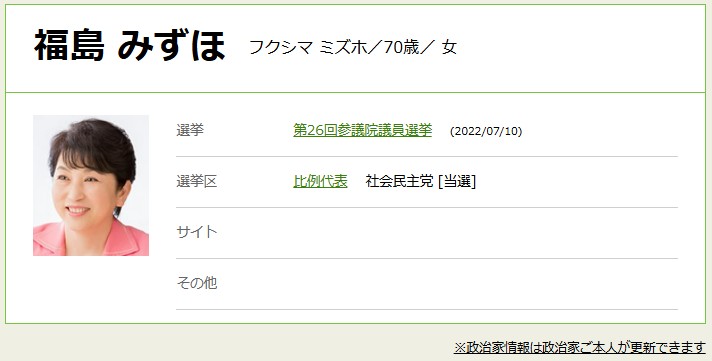 福島氏は1955年、宮崎県生まれ。東京大学法学部卒業後、弁護士として活動して1998年参院選で初当選し、現在5期目。2009年の鳩山政権で内閣府特命担当大臣に就任して男女共同参画・自殺防止・少子化対策などを担当しましたが、2010年に辺野古への新基地移設の閣議決定の署名を拒否して大臣を罷免されました。これまで、党首や副党首、幹事長などの党役職も歴任しました。