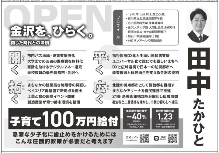 田中氏は石川県白山市生まれ、名古屋商科大学産業経営科卒業、2025年に金沢大学大学院人間社会環境研究科 経済学専攻博士前期課程修了。株式会社北國新聞社、株式会社エヌ・ティ・ティ北陸テルマック、白山建設株式会社、株式会社ノエチカ代表取締役を経て、2015年から石川県議会議員選挙で3期連続当選しました。今回の金沢市長選挙への立候補に伴い、3月1日付で石川県議会議員を自動失職しました。