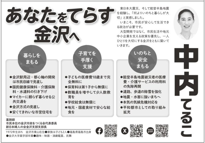 中内氏は福島県福島市出身、金沢大学薬学部卒業。大学卒業後から薬剤師として勤務しています。現在は新日本婦人の会金沢支部長、「市民本位の金沢市政をつくる会」代表委員を務めています。