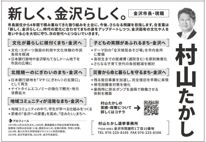 村山氏は東京都生まれ、慶應義塾大学総合政策学部卒業。自治省(現 総務省)に入省し、総務省自治財政局公営企業課理事官、川崎市財政局財政部長、香川大学人文社会科学系教授、総務省情報公開・個人情報保護審査会事務局審査官、防衛省防衛政策局日米防衛協力課日米同盟調整企画官等を歴任。2019年から金沢市副市長を務め、2022年の金沢市長選挙で初当選。今回は2期連続当選を目指しての立候補となります。