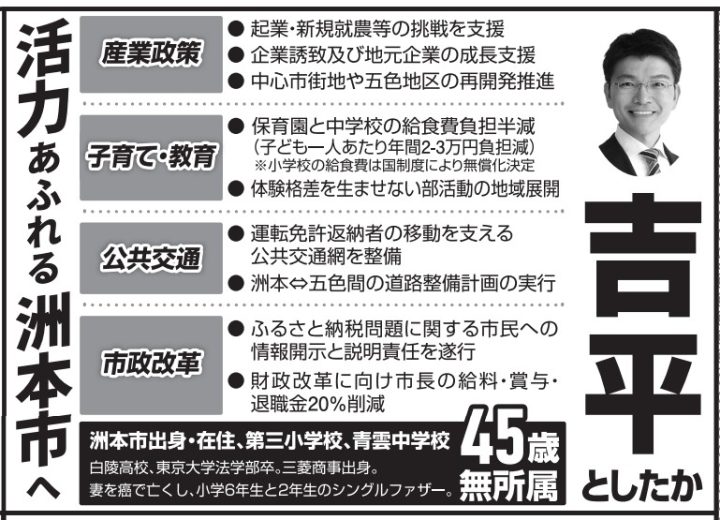吉平氏は洲本市出身、東京大学法学部卒業。三菱商事株式会社に18年間勤務しました。2025年の参議院選挙(兵庫県選挙区)に挑戦しました。