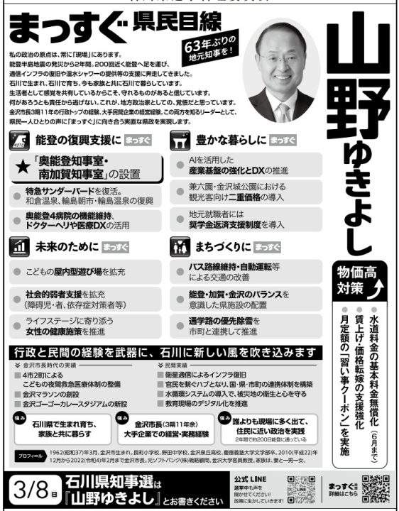 山野氏は石川県金沢市生まれ、慶應義塾大学文学部卒業。金沢市議会議員を経て、2010年12月から2022年2月まで金沢市長を務めました。石川県知事選挙は2022年に続き2度目の挑戦となります。