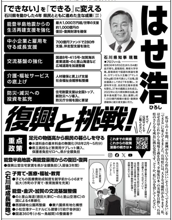 今回は馳県政の是非、2024年に発生した能登半島地震や奥能登豪雨からの復旧・復興策、防災対策、物価高対策、産業振興策、医療・福祉の充実などが争点と考えられます。