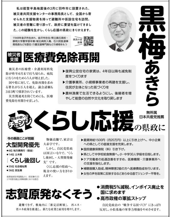 黒梅氏は石川県金沢市生まれ、静岡大学農学部卒業。勤労者医療協会城北病院に入職し、石川県民主医療機関連合会事務局長、石川革新懇事務局長、能登半島地震被災者支援共同センター事務局長等を歴任しました。