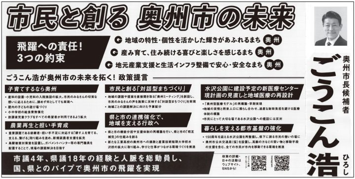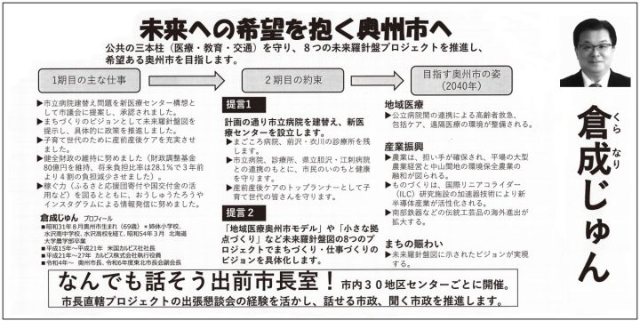 今回は倉成市政の是非、総合水沢病院の後継施設として水沢公園陸上競技場に建設予定の新医療センター計画の是非、人口減少対策、市が2億円余りをかけて取得した旧商業施設の活用法などが争点と考えられます。