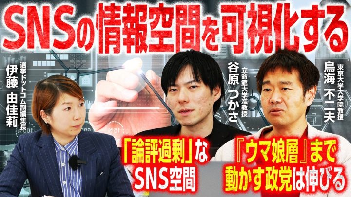 SNSが選挙結果を左右する時代。しかし、私たちの画面に映る「盛り上がり」は、果たして社会の「真実」を映し出しているのでしょうか。選挙ドットコムとJX通信社の調査で、SNSの中で政治選挙情報の情報源として使われているツートップは「X(旧Twitter)」と「YouTube」です。2月18日公開の「選挙ドットコムちゃんねる」では、東京大学大学院教授の鳥海不二夫氏と立命館大学准教授の谷原つかさ氏をゲストに迎え、衆院選期間中のXとYouTubeの調査データから見えた「ネット選挙」の実態と、その裏側にある構造的特徴を解説していただきました。