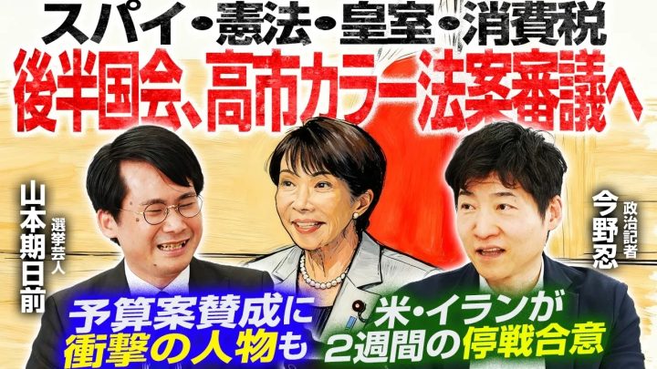 4月8日公開の「選挙ドットコムちゃんねる」では、後半国会の論点を政治ジャーナリストの今野忍記者とMCの選挙芸人・山本期日前氏が解説!緊迫するイラン情勢を受け、高市総理が進める「責任ある積極財政」や安全保障、インテリジェンスの強化はどう動く?