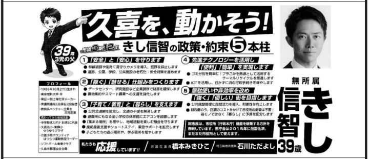 4月12日に告示された久喜市長選挙には、新人の貴志信智(きし・のぶとも)氏(39)、新人の渡辺優(わたなべ・まさる)氏(73)、自由民主党が推薦する現職の梅田修一(うめだ・しゅういち)氏(51)の無所属3名が立候補しました。投開票は4月19日に行われます。
