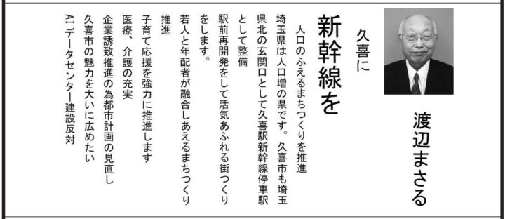 埼玉県久喜市長選挙 4月19日投票 立候補者一覧はこちら>>