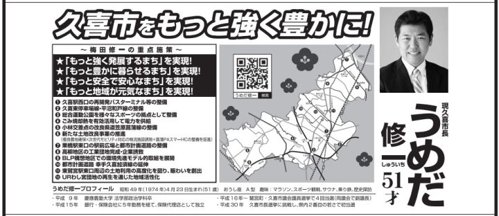 梅田氏は久喜市生まれ、慶應義塾大学法学部政治学科卒業。銀行員、外資系保険会社を経て保険代理店を創業しました。2004年から旧 鷲宮町(現 久喜市)議会議員を2期、2010年から久喜市議会議員を2期務め、2018年の久喜市長選挙で初当選。今回は3期連続当選を目指しての立候補となります。